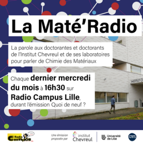 Avec la Maté'Radio, chaque dernier mercredi du mois à 16h30 sur Radio Campus Lille, durant l'émission Quoi de neuf ?, une doctorante ou un doctorant d'un des laboratoires de l'Institut Chevreul1 vient expliquer ses travaux de recherche et raconter son parcours et son quotidien.