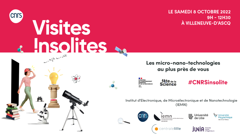 A l'occasion de la Fête de la Science, le CNRS ouvre les portes de ses laboratoires, observatoires, plateformes scientifiques et sites de recherche en France métropolitaine pour les "Visites Insolites du CNRS". Cette année, rendez-vous à l'Institut d'Electronique, de Microélectronique et de Nanotechnologie1 (IEMN) pour une Visite Insolite sur le thème "Les micro-nano-technologies au plus près de vous".