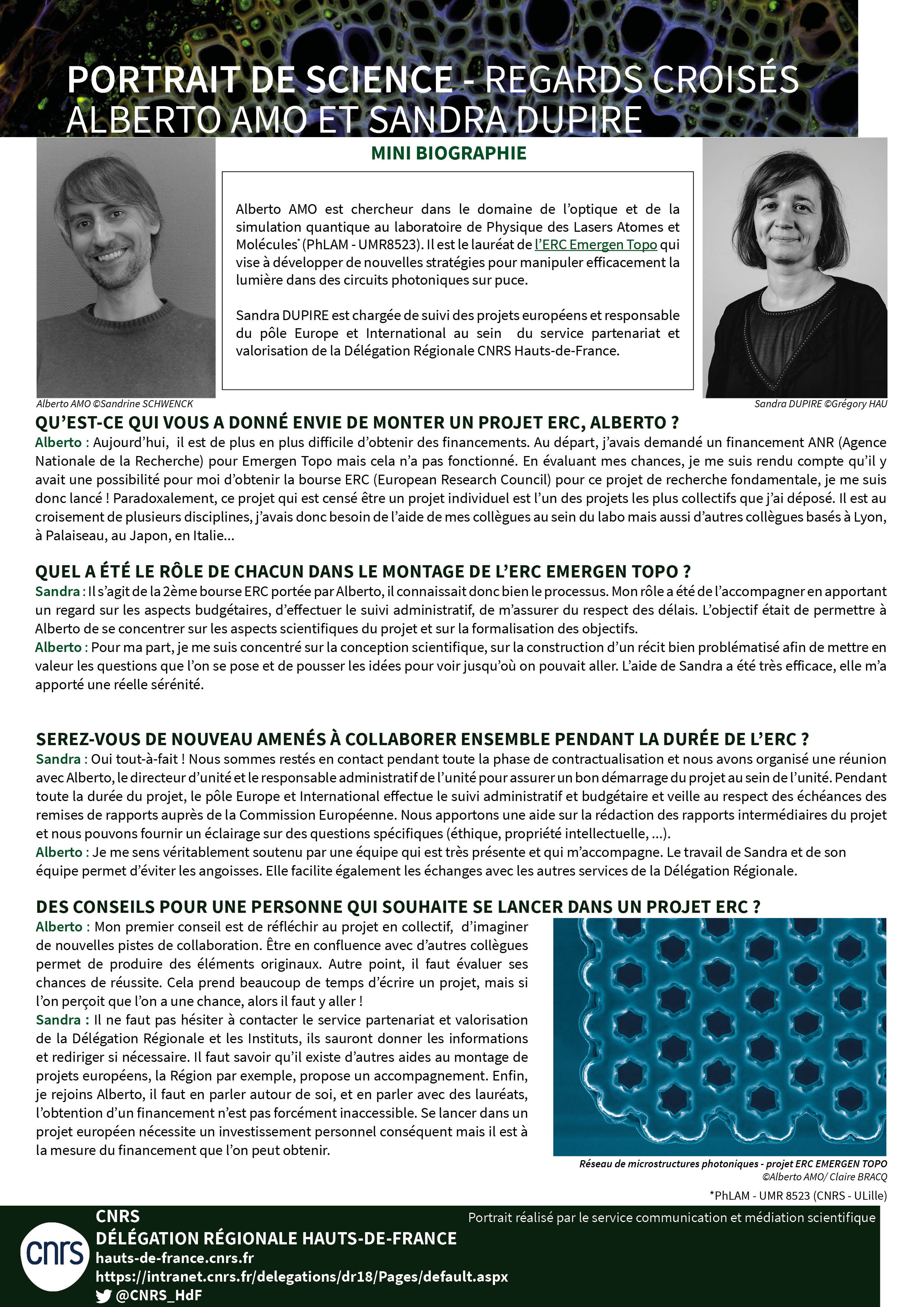 Alberto AMO est chercheur dans le domaine de l’optique et de la simulation quantique au laboratoire de Physique des Lasers Atomes et Molécules (PhLAM - UMR8523). Il est le lauréat de l’ERC Emergen Topo qui vise à développer de nouvelles stratégies pour manipuler efficacement la lumière dans des circuits photoniques sur puce.