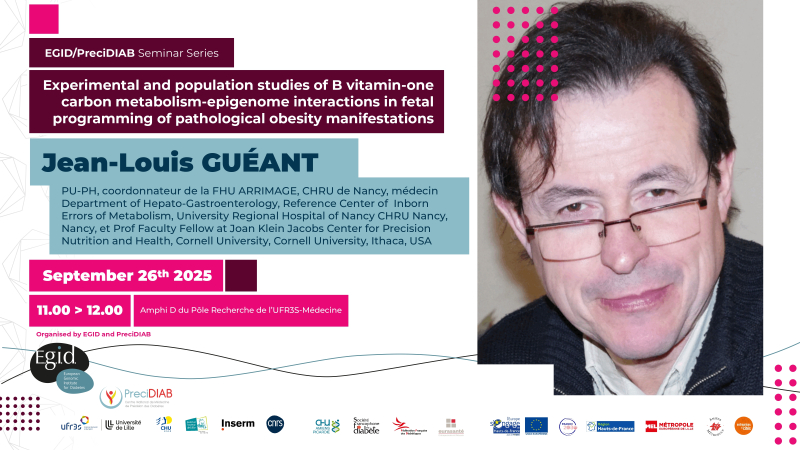 EGID et PreciDIAB organisent une conférence le vendredi 26 septembre 2025 à 11h00 au pôle recherche (amphi D) avec la venue du Pr Jean-Louis Guéant sur le thème: "Experimental and population studies of B vitamin-one carbon metabolism-epigenome interactions in fetal programming of pathological obesity manifestations". Inscriptions jusqu'au 19 Septembre.