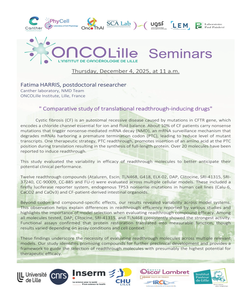 Ce séminaire se portera sur : "Comparative study of translational readthrough-inducing drugs".